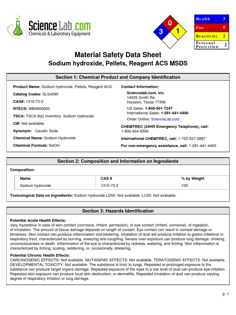 Safety Data Sheet Sodium Hydroxide Pellets SECTION 11 PRODUCT IDENTIFICATION Product. SAFETY DATA SHEET SODIUM HYDROXIDE SECTION 1. Material Safety Data Sheet Page 2 of 2 2008 Scholar Chemistry.